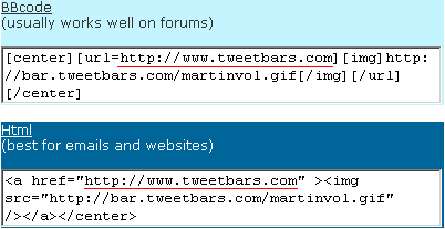 La página es simple, colocas tu nombre de usuario y te ofrece códigos en BBcode y HTML. El único problema es que la dirección a la que apunta el banner es hacia TweetBars. ¿Solución? Muy fácil, solamente tenés que reemplazar, en el código que elegiste, lo que está subrayado en esta imagen por la dirección de tu cuenta.