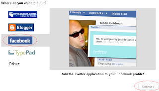 1- Logeate en Twitter 2- Entra a http://twitter.com/badges 3- Seleccione Facebook y click en “Continue” 4- Click en “Install Twitter in Facebook” 5- Luego aceptas la aplicación 6- Listo :)